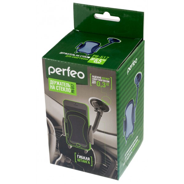 Автомобильный держатель Perfeo-517 предназначен для установки смартфона/навигатора на лобовом стекле, боковом стекле или другой гладкой поверхности при помощи присоски\n\nВозможна установка с помощью дополнительного аксессуара – Magic Sticker – на практически любую не гладкую поверхность\nПрисоска диаметром 70мм удержит планшет весом до 0,3 кг\nГибкая штанга и регулировка угла наклона позволяют зафиксировать устройство под любым углом\nМягкие зажимы с регулируемым расстоянием между ними (55-110 мм) не препятствуют полноценному использованию устройства, сохраняя удобный доступ к разъемам, и не повреждают поверхность устройства\nПростая установка/снятие без использования инструментов\nОсновные характеристики\n\nКрепится на стекло\n \n \nДля крепления смартфона/навигатора до 6.5\"\n \n \nРасстояние между лапками 55-110 мм\n \n \nМакс.вес устройства 0,3 кг\n \n \nДиаметр присоски 70 мм\n \n \nРегулировка угла наклона да\n \n \nПоворот на 360 градусов да\n \nМатериал металл, пластик, силикон