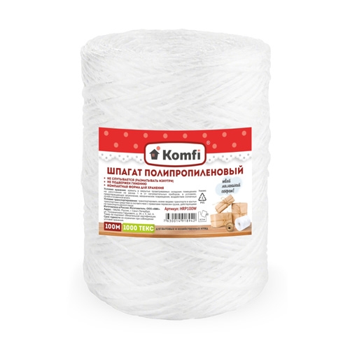 Цилиндр» - компактная форма для хранения и размещения на полке, более устойчив, по сравнению с «клубком».\nНе подвержен гниению.\nУниверсальный материал для упаковки и обвязки.\nПолипропиленовый шпагат прочен на разрыв, устойчив к влиянию агрессивной среды - к растворителям, щелочам и кислотам, высокой влажности, кипящей воде. Не вытягивается и устойчив к трению и изгибам, не подвержен гниению. Безопасен для здоровья человека. Представлен в широком ассортименте цветов - синий, красный, зеленый, желтый, белый.\n\nТорговая марка Komfi\n\nОбласть применения \n\nДля бытовых и хозяйственных нужд.\nПреимущества\n\nУпакован в гофротару, что гарантирует его сохранность при транспортировке.\nИндивидуальная упаковка - в термоусадочную пленку.\nНаличие цветной этикетки со штрих-кодом.\nНе спутывается (разматывать изнутри).
