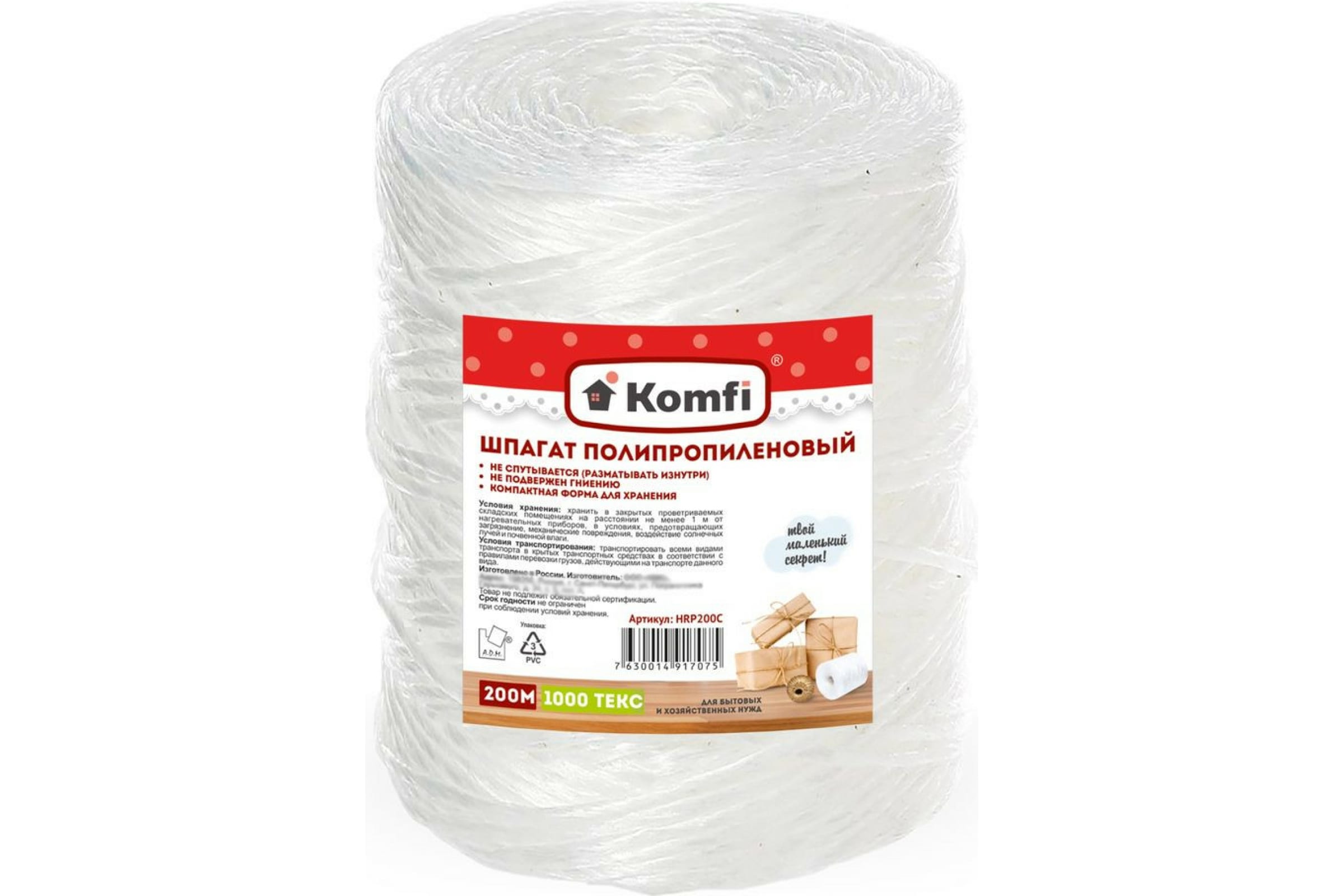 HRP200W Шпагат полипропиленовый, цилиндр, 1,6ммx200м белый 1000 Текс Komfi/40