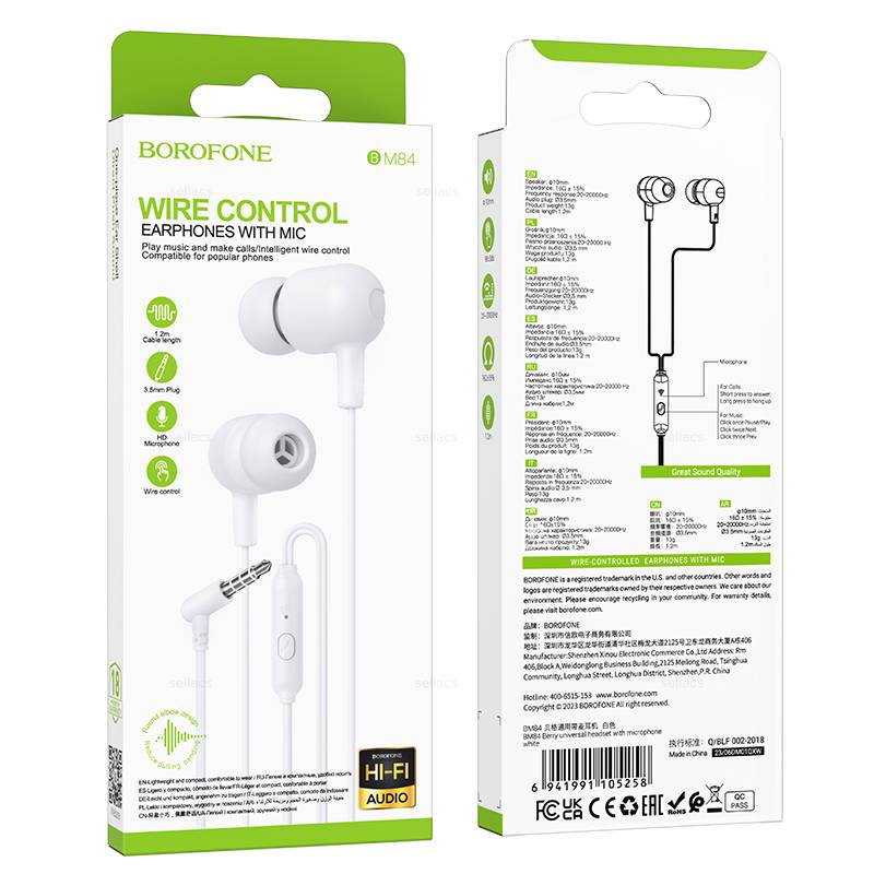Наушники проводные внутриканальные BOROFONE BM84 белый