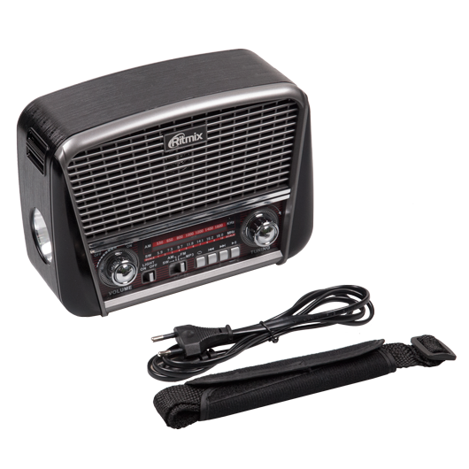 Ritmix RPR-065 – портативный трёхдиапазонный радиоприёмник, охватывающий в том числе и FM-диапазон. Дополнительная функция – воспроизведение MP3-файлов с карт памяти или USB-флэшки. Устройство снабжено встроенным фонарём повышенной яркости.\n\nПортативный трёхдиапазонный радиоприемник FM / AM / SW\nФункция MP3-плеера (читает файлы с microSD/SD/USB носителей)\nЯркий встроенный фонарь\nПитание от встроенного аккумулятора, от сети 220В, от батареек типа D (2 штуки, в комплект не входят)\nТелескопическая антенна 360° для уверенного приёма\nAUX IN