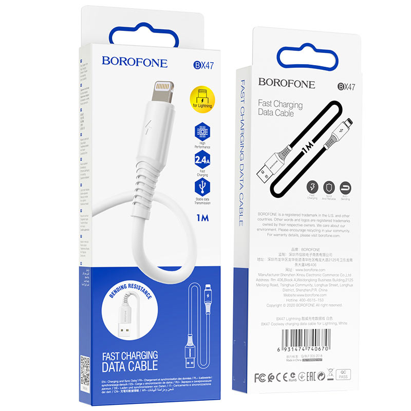 USB-кабель BOROFONE BX47 Coolway AM-8pin (Lightning) 1 метр, 2.4A, ПВХ, белый,черный