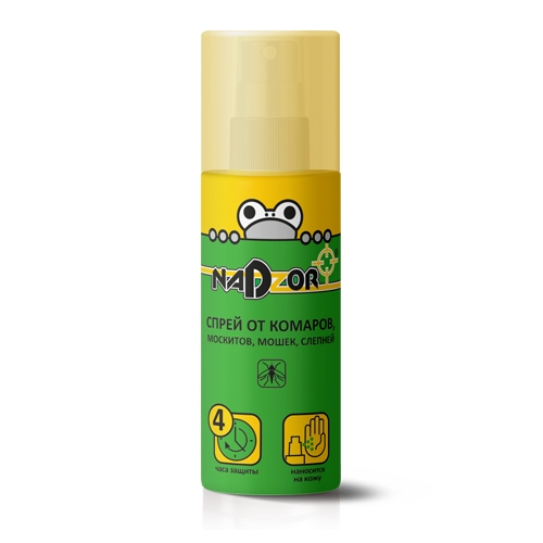 Описание\n\nНадежная защита от комаров и мошек.\nВремя защитного действия - 4 часа.\nУдобство использования – легко распылять на тело и одежду.\nСредство предназначено для защиты людей от нападения кровососущих насекомых - комаров, москитов, мошек, слепней. Спрей необходимо нанести тонким слоем без втирания на открытые части тела: лицо, руки, шею, ноги. Время защитного действия от насекомых - до 4 часов. При необходимости обработку повторить.\n\nТорговая марка Nadzor\n\nОбласть применения\n\nЗащита от комаров на открытом воздухе.\nПреимущества\n\nНе оставляет жирных следов.\nПомогает справиться не только с комарами, но и с москитами, мошками, слепнями.\nУдобный размер флакона - легко брать с собой.\nОтличное соотношение цены и качества.\nКрасочная упаковка.\nПопулярная форма выпуска.