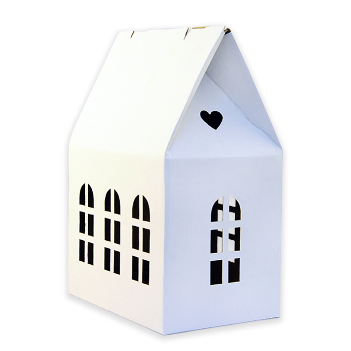 При покупке подарка важно удачно подобрать упаковку. От нее зависит восприятие подарка, положительные эмоции при его вручении. Красивая и вместительная подарочная коробка \"Домик\" отлично подходит для оформления подарков к любому празднику: кружек, мягких игрушек, футболок. Домик выполнен из плотного белого картона.\nВ собранном виде высота коробки 25 см, длина 18 см, ширина 12 см.